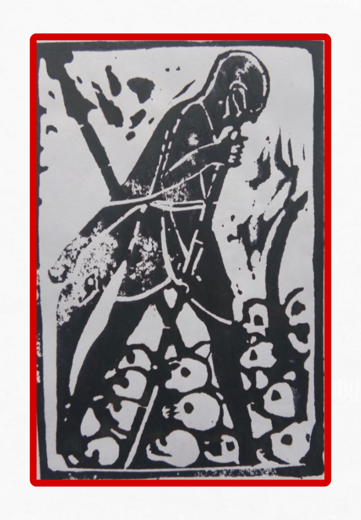 This is a striking black and white artwork depicting a person playing a stringed instrument, possibly a violin or a similar folk instrument. The artwork is done in a bold, stencil-like style with a red border framing the composition. The background has abstract elements and shapes, adding a dynamic feel to the piece.