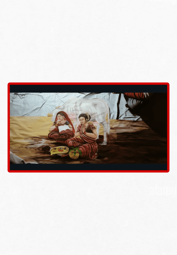 The painting depicts two women in traditional attire sitting on the ground, engaged in a quiet moment together. One woman wears a red sari with a matching head covering, while the other has a striped red sari. They are surrounded by simple offerings like a yellow plate with food and a coconut. The background shows a crumpled white sheet and earthy tones, evoking a sense of calm intimacy. The artwork is framed by a red border with black accents on a white background.